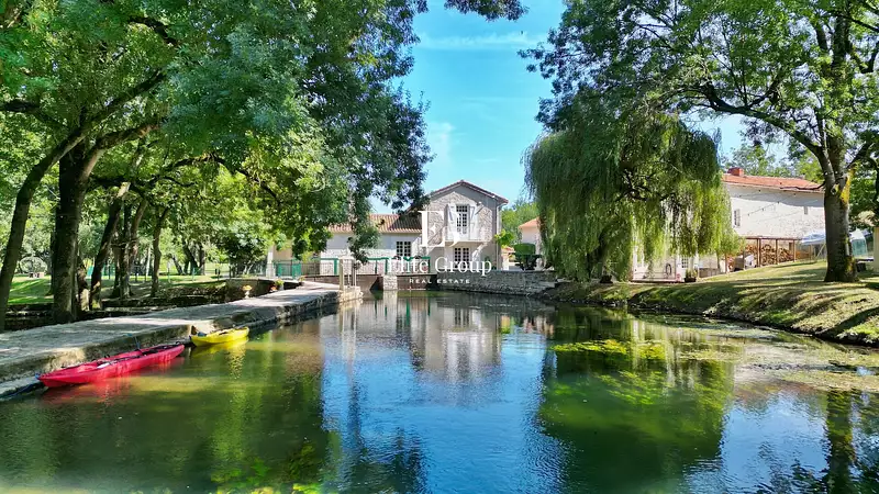 ELITE GROUP Real Estate a le plaisir de vous présenter ce magnifique moulin du XVème siècle, situé en bordure de la Charente, à seulement 30 min au nord d'Angoulême. Implanté dans un cadre naturel d'exception, ce bien unique offre un environnement paisible et enchanteur. Cette propriété de charme se compose de trois maisons d'habitation distinctes. La maison principale, d'environ 290 m², vous accueille avec une entrée qui mène à un salon spacieux, une salle à manger lumineuse et une très grande cuisine avec coin salon et bar. Vous y trouverez également une buanderie, une réserve, ainsi qu'une suite parentale au rez-de-chaussée, dotée d'une terrasse privative avec vue sur la piscine et d'une magnifique salle de bains avec dressing. A l'étage, deux chambres disposent chacune de leur salle de bains privative et d'un espace dressing. La maison d'amis, d'environ 150 m², vous charmera par son entrée ornée d'un magnifique escalier en pierre. Elle comprend une cuisine aménagée et équipée avec salle à manger et cheminée, un salon chaleureux avec cheminée, quatre chambres dont deux suites parentales avec salle d'eau et WC, ainsi qu'une salle d'eau supplémentaire avec WC. Le gîte, d'environ 107 m², offre une grande pièce de vie avec une cuisine ouverte, un coin repas, un salon, trois chambres et une salle de bains, parfait pour recevoir famille et amis. Chaque habitation dispose de sa propre terrasse extérieure privée, idéale pour profiter de la tranquillité du cadre environnant. La propriété comprend également un double garage, une remise, une cave, et une chaufferie. La belle piscine avec cuisine d'été est parfaite pour les journées ensoleillées et les moments de détente en plein air. Le domaine s'étend sur près de 5 hectares, dont environ 3,8 hectares de prairies, avec de nombreux abris pour chevaux. Les deux îles privées, accessibles par des passerelles, ajoutent une touche de charme supplémentaire à cet endroit unique. Sans voisinage direct, ce moulin offre un véritable coin de paradis, sans aucune nuisance, idéal pour ceux en quête d'un cadre de vie exceptionnel. N'attendez plus pour découvrir cette propriété de caractère et laissez-vous séduire par son ambiance unique. Contactez-nous dès maintenant pour organiser une visite! (5.00 % honoraires TTC à la charge de l'acquéreur.)