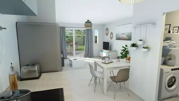 Maison en prêt à finir, entièrement personnalisable à votre goût. Terrain non inclus, hors frais annexes – Construction Creatik Solution incluse (sous réserve de disponibilités foncières) – Visuels non contractuels. Contactez nous pour concrétiser votre projet !
