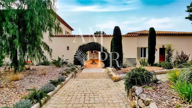 Grande propriété, aux larges volumes et aux prestations raffinées, Vue panoramique sur les collines et la mer. Calme, nature et proche de tout. La propriété se compose d'une villa principale et de 2 appartements, un de 3 pièces de 110 m2, et un autre de 2 pièces de 42 m2. L'entrée qui se fait par un charmant patio fleuri avec sa fontaine, vous menant à la villa principale, qui se compose d'une entrée, large salon avec cheminée ouvrant sur une terrasse. Salle à manger, grande cuisine indépendante, arrière cuisine, cellier et buanderie, grand bureau, 3 chambres et leurs salles de bains en suite, à l'étage : 3 autres chambres en suite dont une de Maître ouvrant sur belle terrasse avec vue mer, au niveau rez-de-jardin, Salon avec bar/salle de jeu ouvrant sur terrasse, salle de sport, sauna et jacuzzi, salle de cinéma, et cave à vins. Beau jardin paysager de plus de 4 400 m2 avec piscine, complanté d'essences méditerranéennes, nombreux palmiers et oliviers. Double garage avec atelier, abri voiture et plusieurs parkings.