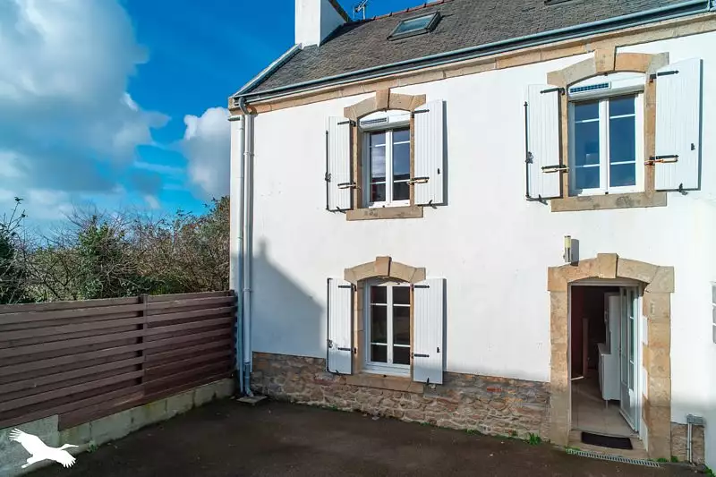 Esquibien, centre-ville, charmante maison en pierres composée en rez-de-chaussée d'une cuisine ouverte sur salon-séjour de 24m2, à l'étage, une chambre, salle d'eau avec WC, buanderie. Sous les combles bel espace de nuit de 18,16m2 en surface au sol. Cour intimiste. Pas de travaux à prévoir. Joli pied à terre