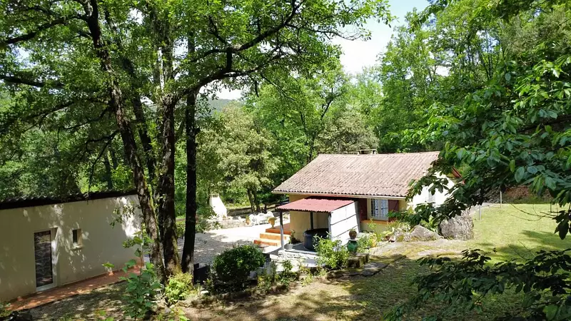 Perché au sommet d'une colline, sans aucun vis-à-vis ni voisinage direct, ce charmant mazet vous invite à la tranquillité. Niché au cœur d'un jardin arboré de 1 000 m², il offre plusieurs espaces extérieurs aménagés pour profiter pleinement de la douceur de vivre cévenole :