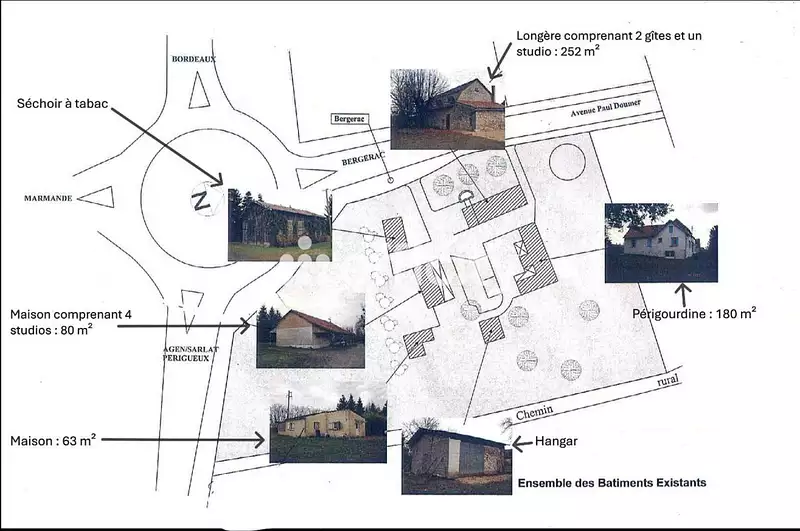 Cet ensemble immobilier unique se compose de 6 bâtiments variés sur un vaste terrain de 13 736 m², comprenant notamment une maison type longère, une maison type périgourdine, un hangar, une maison traditionnelle, une maison comprenant 4 studios et un séchoir à tabac. Chaque bâtiment offre un potentiel de rénovation et d'aménagement divers, permettant de réaliser un projet immobilier sur-mesure.