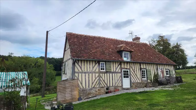 Surplombant les collines du Pays d'Auge, avec une vue magnifique, fermette en colombage rénovée avec goût sur 1706 m² comprenant : salle à manger avec cheminée équipée d'un poêle et tomettes au sol, cuisine aménagée et équipée avec tomettes au sol, wc avec lave-mains avec tomettes au sol, salon ; au 1er étage :une chambre avec charpente apparente et salle de bains privative avec wc et radiateur sèche-serviettes; petit grenier. cave à usage de cuisine d'été; Fenêtres en chêne double vitrage. Isolation des murs et cave. Chauffage par poêle à bois + radiateurs électriques récents.Dépendance à usage de garage-atelier. Terrain avec gloriette en fer forgé avec électricité. Les informations sur les risques auxquels ce bien est exposé sont disponibles sur le site Géorisques : www. georisques. gouv. fr