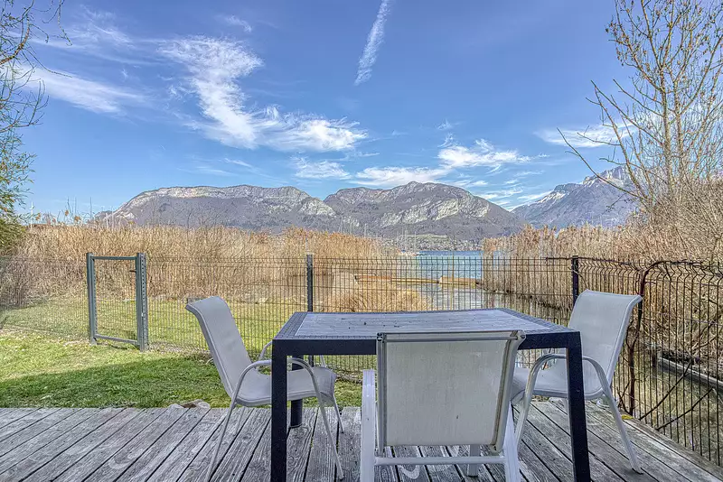 RARE A LA VENTE - RIVE OUEST - CHALET LES PIEDS DANS L'EAU - PONTON ET BOUCLE PRIVE + GARAGE A BATEAUVenez découvrir cette maison unique à la vente.Situé au bord du lac, ce chalet vous offre une pièce de vie avec terrasse, une chambre, salle de douche avec toilette; à l'étage 2 chambres dont une avec sa terrasse sur le lac, salle de douche avec toilette. En annexe une buanderie de 13 m² et un garage à bateau. Le terrain mesure 518 m², il y a possibilité de garer plusieurs véhicules et même un camping-car. Le chalet possède une vue imprenable sur notre lac et les montagnes, vous êtes dans un écrin de verdure avec votre plage privée. Vous avez votre propre ponton ainsi que la boucle à bateau et le chenal remonte directement dans le garage à bateau du chalet. Ce bien est atypique et unique sur le marché, un vrai bijou.