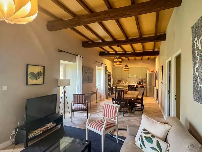 Le salon/salle à manger principal est un espace fantastique pour se divertir. Avec sa large voûte originale en plein cintre, la pièce est divisée en deux parties distinctes. La première dispose d'une belle cheminée en pierre d'époque Louis XV près de laquelle la famille se réunit. C'est l'endroit idéal pour se retrouver à Noël ou en hiver. La deuxième partie de la pièce est utilisée en tant que salle à manger. Le salon et la salle à manger sont toutes deux dotées de grandes fenêtres donnant sur les jardins.