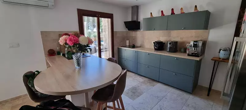 Il se compose d'une belle pièce de vie lumineuse avec cuisine ouverte équipée et îlot central donnant sur un séjour convivial exposé plein sud, climatisation réversible.