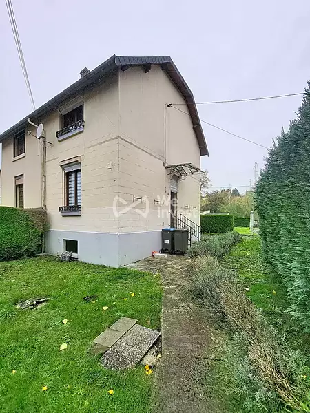 Maison semi individuelle comprenant entrée, cuisine ouverte sur séjour, salle d'eau, WC. A l'étage: 2 chambres, cave, terrain, garage.
