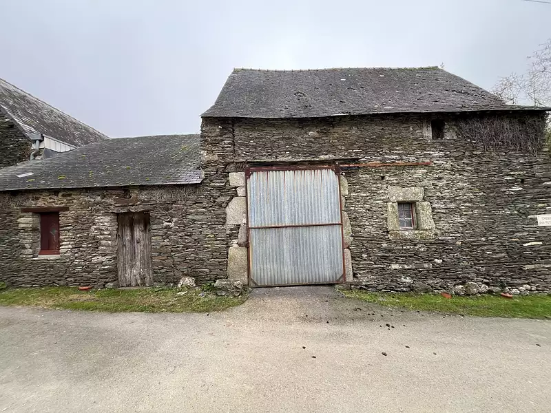 Un bâtiment en pierre recouvert d'ardoise fibro d'environ 60 m² au sol composé en deux parties :