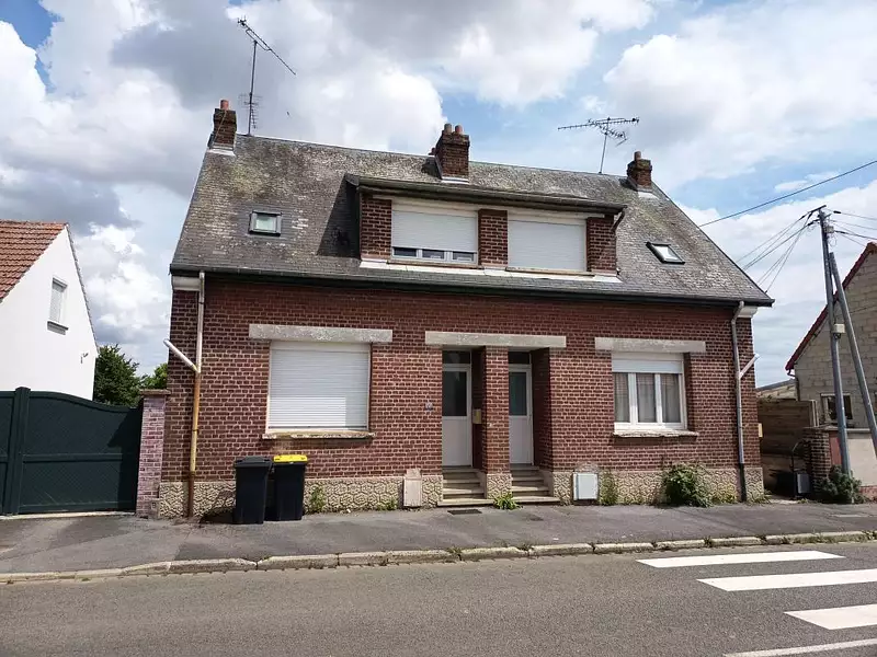 Maison mitoyenne d'un côté comprenant une entrée donnant sur une pièce de vie, une cuisine et un toilette. A l'étage un palier dessert 2 chambres et une salle d'eau. Cours et cave.