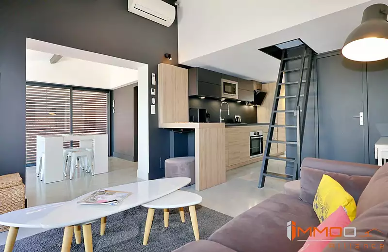 Au rez-de-chaussée, vous serez séduit par l'espace de vie (Le séjour, la salle à manger et la cuisine) de 26 m², sont baigné de lumière naturelle grâce à sa grande baie aluminium en accordéon donnant sur la terrasse. La cuisine aménagée et équipée ainsi que la salle d'eau avec WC complètent ce niveau. l'ensemble est décoré avec goût et dans un style contemporain.