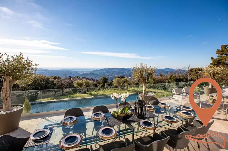 Cette villa meublée de prestige (620 m²) nichée sur 6 000 m² de terrain paysager offre une vue mer époustouflante, piscine, terrasses et prestations haut de gamme.