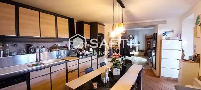 À l'intérieur, la maison de 82 m² au sol (60 m² habitables) se compose au rdc d'une spacieuse cuisine dinatoire entièrement équipée, ouvrant sur un séjour lumineux avec cheminée à insert, d'une salle d'eau avec douche, double vasque et wc. À l'étage, un palier dessert deux chambres de belle superficie avec rangements, offrant un intérieur fonctionnel et confortable pour ses occupants.