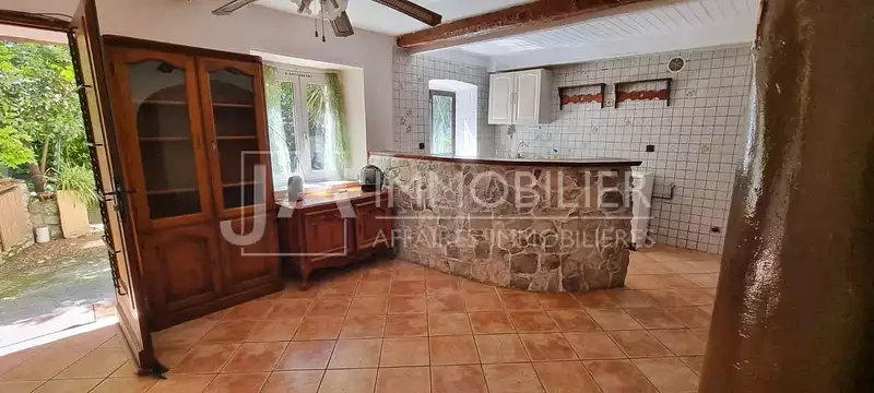 La maison se compose, au rez-de-jardin : d'un séjour avec cuisine type américaine, un cellier et un abri de jardin. A l'étage : Deux chambres, salle de bains avec W.C.. une buanderie extérieure, un abri de jardin, un W.C. a l’extérieur.