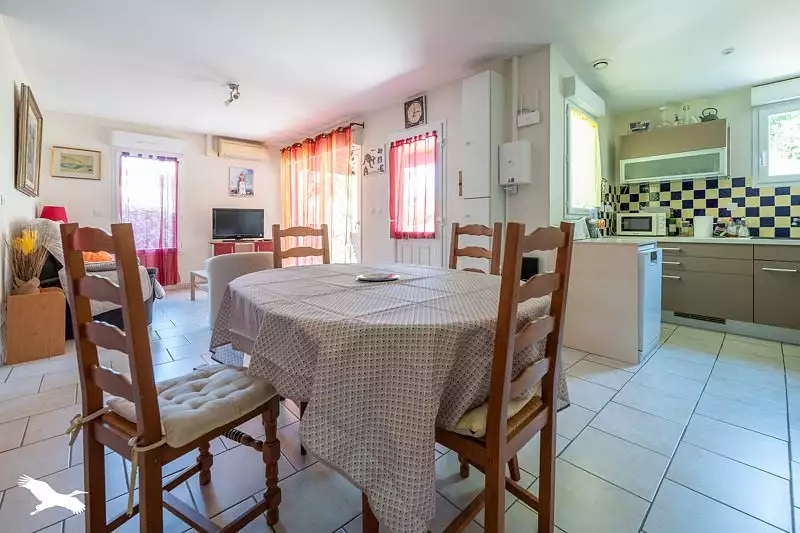 Commerces à pied, plage à 4km environ, pavillon de plain pied offrant séjour lumineux avec cuisine équipée, deux chambres, salle d'eau . L'ensemble sur un jardin clos de plus de 280m²