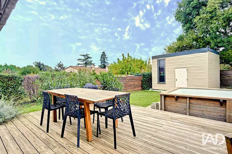 Tout ceci sur un terrain clos et sans vis à vis de 366m2 environ, avec sa belle terrasse bois et sa piscine semi enterrée.