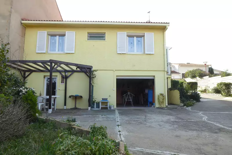CANET VILLAGE, une maison trois faces de plain-pied, composée d'une entrée, séjour, cuisine séparée, 2 chambres, salle d'eau, wc, cuisine dété de 32 m2 en contre-bas, avec salle d'eau et wc , grand garage, donnant sur pergola jardin et terrasse - forage , portail électrique, double vitrage, volets électriques, chauffage électrique et climatisation séjour + chambre sur un terrain de 406m2 - référence 3357 -