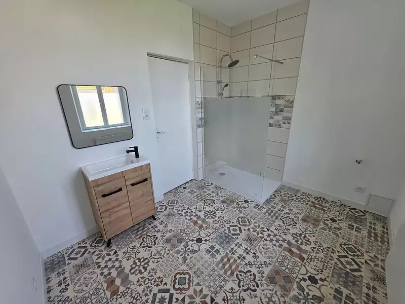 A l'étage : palier, une grande chambre, salle de bains avec douche et wc