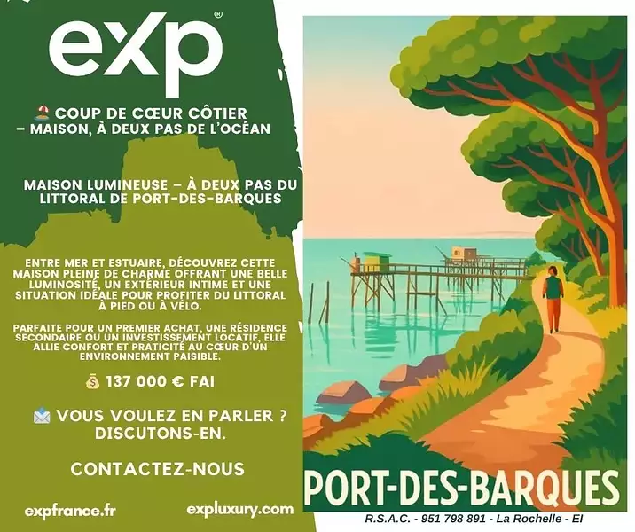 Une maison clé en main, dans une commune prisée de la Charente-Maritime, entre authenticité et douceur de vivre. 127,000 € Honoraires d'agence non inclus - Honoraires agence: 7.87%TTC Honoraires à la charge de l'acquéreur - Montant estimé des dépenses annuelles d'énergie pour un usage standard, établi à partir des prix de l'énergie de l'année 2023 : 1890€ ~ 2600€ - Les informations sur les risques auxquels ce bien est exposé sont disponibles sur le site Géorisques : www.georisques.gouv.fr - Erwan MINEAU - Agent commercial - EI - RSAC La rochelle 951798891