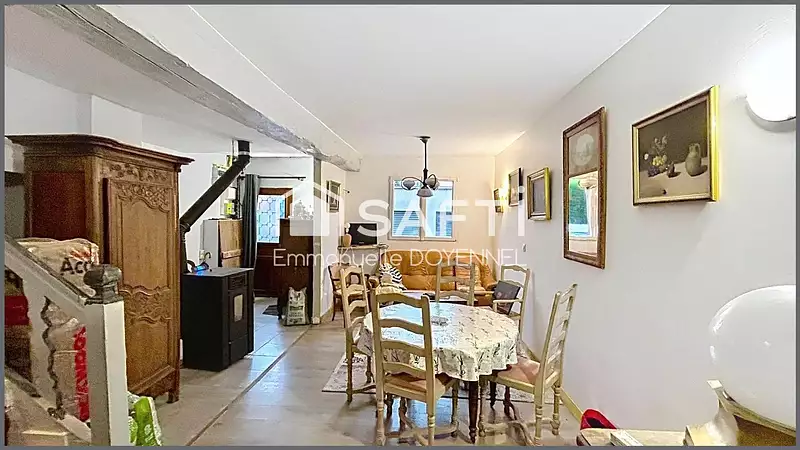 Maison mitoyenne rénovée comprenant : séjour avec poêle à granulés, cuisine aménagée et équipée, WC, accès à une cour privative.