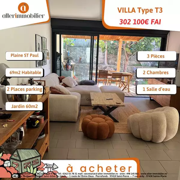 Située dans un lotissement calme et sécurisé, Alter Immobilier vous présente une villa de type T3 duplex. Avec une superficie habitable d'environ 69m2, cette villa comprend une agréable varangue d'environ 12,07m2 donnant sur un jardin d'agrément d'environ 60m2.