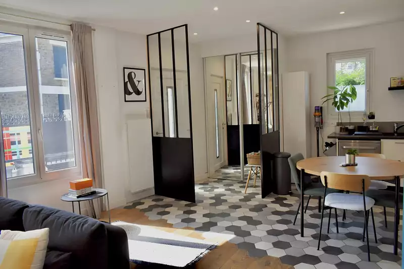 Au rez-de-chaussée, une entrée avec placard séparée par des verrières, cuisine US totalement équipée et dînatoire de 11,62 m2 donnant sur un séjour/salon parqueté de 21,07 m2 exposé Est.