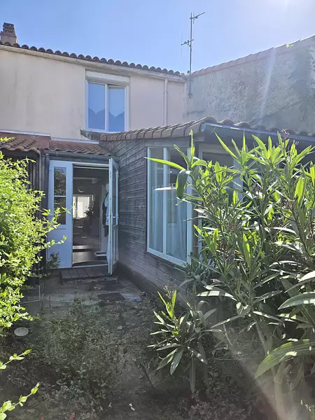 Elle est pleine de charme avec ses poutres claires et le poële à granulés dans la pièce de vie, cuisine, wc et SAS d'accès au jardin qui donne sur une jolie dépendance pour bricoler ou stocker.