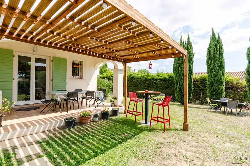 Découvrez un havre de paix avec un superbe jardin privatif d'environ 200 m² clôturé, l'un des plus grands de la résidence, entièrement arboré, aménagé avec une terrasse couverte et une pergola bois, idéale pour profiter des journées ensoleillées ou des soirées douces en plein air.