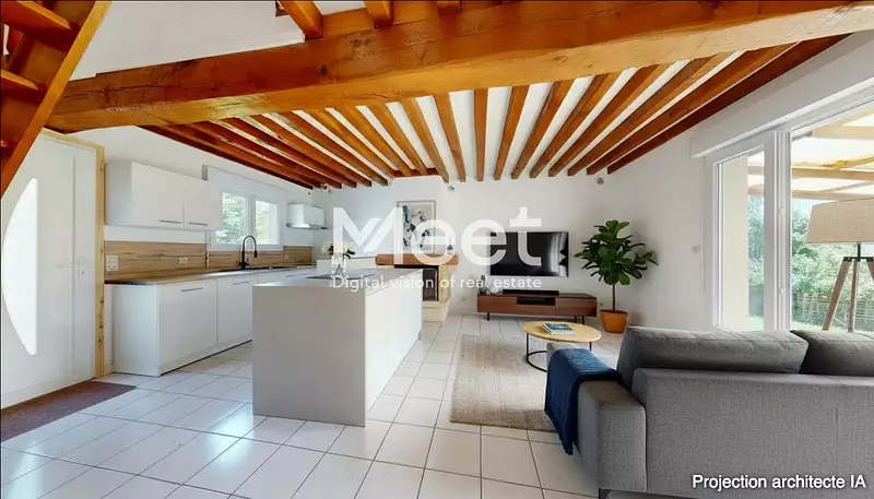 - une entrée sur la pièce de vie d'environ 28m2 avec une cuisine et un accès au jardin.