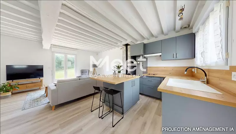 - une entrée sur la pièce de vie d'environ 25m2 avec une cuisine américaine et un accès au jardin.