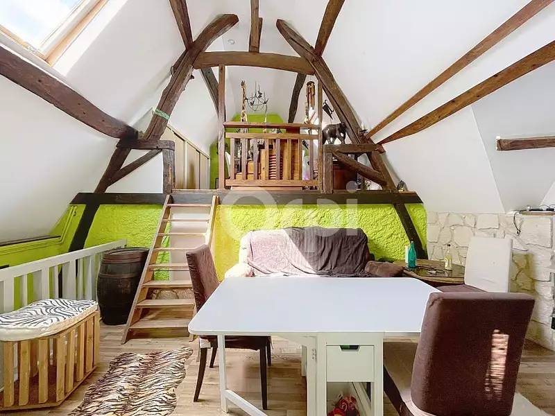 - Au deuxième : un salon avec très belle hauteur sous plafond, une chambre en mezzanine.