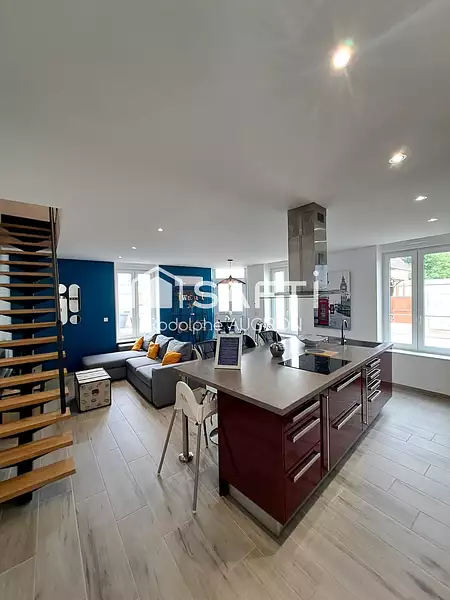 L'entrée donne sur une grande pièce à vivre très lumineuse de plus de 53 m2, avec toujours au rez-de-chaussée une salle d'eau et un wc séparé.