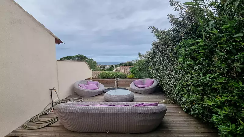 Mazet de 75m² dans résidence avec piscine comprenant une cuisine ouverte entièrement équipée donnant sur la pièce à vivre, terrasse et jardinet