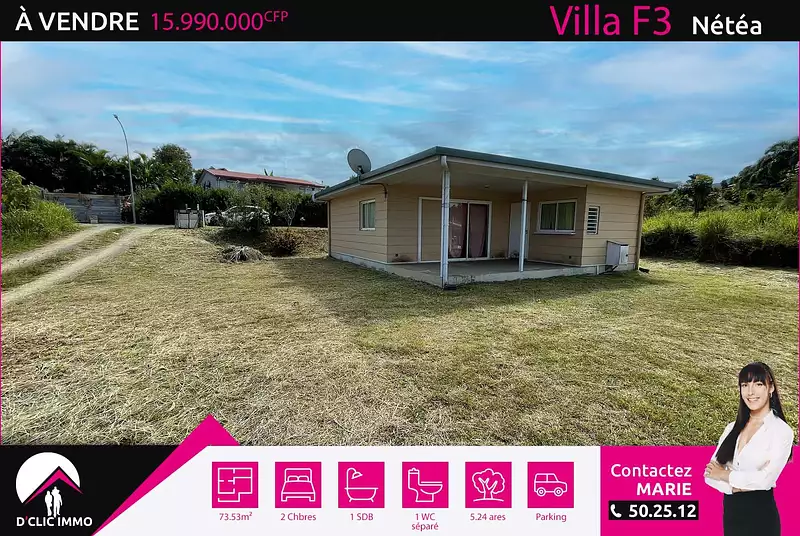 Située dans le quartier résidentiel et familial de Nétéa, l'agence D'CLIC IMMO vous propose une villa récente datant de 2018, de type F3 en clin, de 57.53m² habitable + 16m² de terrasse couverte sur un beau terrain plat de 5.24 ares.