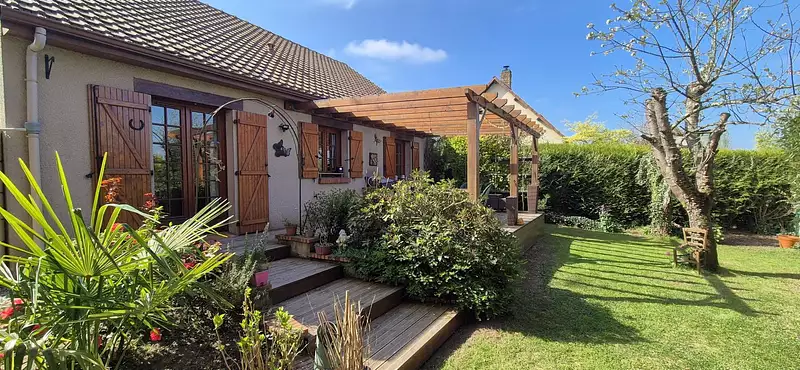 Elle se compose d'une entrée, un séjour avec cheminée insert et salle à manger donnant sur une superbe terrasse en bois avec une pergola. Dégagement , cuisine aménagée et équipée, WC indépendant, deux chambres parquetées, et une salle de douche récente. En extérieur terrasse en bois avec pergola d'environ 25m² , beau jardin plat et arboré d'environ 600m² . Aire de stationnement pouvant accueillir 4 véhicules aisément.