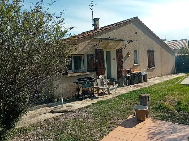 Maison des années 1970 de plain pied de 75m² composée d'une pièce à vivre avec une cheminée, une cuisine indépendante avec un cellier, une chambre, une salle d'eau/wc et une véranda sur 616m² de terrain clos et arboré.