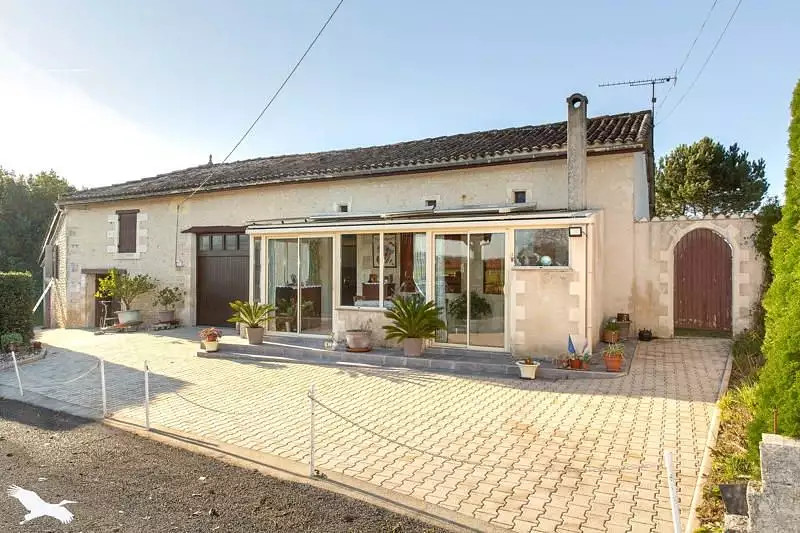 A Chatenet dans un environnement calme avec une vue dégagée sur la campagne environnante. Cette maison en pierre propose cusine, séjour et deux chambres ainsi qu'une véranda. Des dépendances attenantes comprenant garage, grange avec une belle charpente, cave et étable. Ainsi qu'un hangar face à la maison sur terrain constructible.