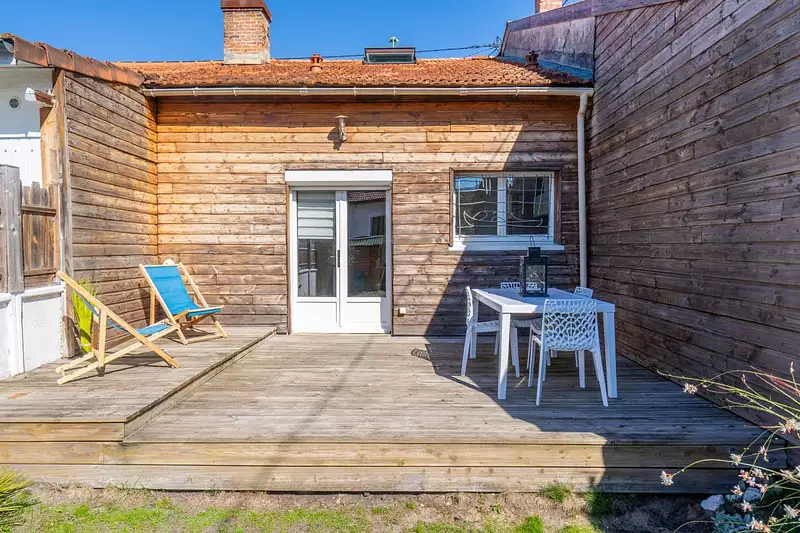 Une terrasse en bois de 20 m², exposée plein sud, idéale pour recevoir ou profiter des beaux jours en toute intimité.