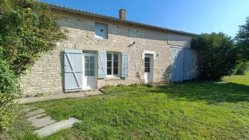 GOURDON IMMOBILIER vous propose à la vente, EN EXCLUSIVITÉ, dans un environnement agréable, proche de toutes les commodités et à 10 km de Neuville de Poitou, une maison en pierre de plain-pied, environ 77 m2 habitables, comprenant : pièce de vie avec coin cuisine, couloir, deux chambres, dégagement, buanderie, salle d’eau, WC, débarras.