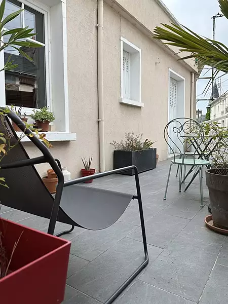Maison de ville, terrasse, double garage. Profitez d'un cadre de vie indépendant et au calme, dans cette maison constituée de deux belles chambres de 13 et 14m², une cuisine indépendante et un salon tous deux donnant sur une terrasse privative Ouest de 15m². Chaudière 2020, électricité revue, menuiseries extérieures double vitrage. Le double garage offre un réel plus. Possibilité 3 chambres. Pas de charges de copropriété. DPE classé D (185) en consommation d'énergie primaire. Consommation comprises entre 1350 et 1880 euros, prix moyen des énergies indexé sur les années 2021, 2022 et 2023 abonnements compris. Copropriété de 2 lots - dont 2 lots habitation.(Pas de procédure en cours).