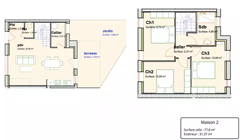 | 77 m² - 4 pièces - 3 chambres | Terrasse |