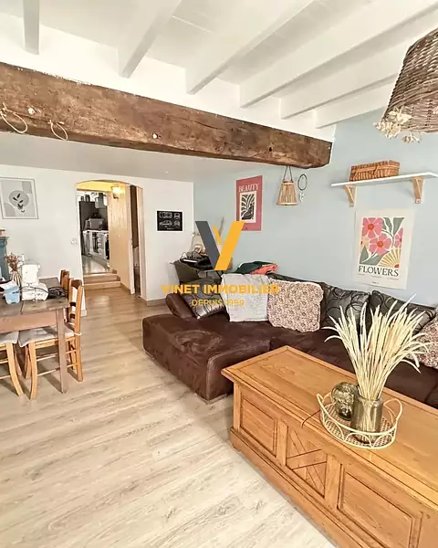 Exclusivité, idéal investisseur, dans le bourg, maison d'environ 84 m2 au sol rénovée récemment : salon séjour avec poutres apparentes, cuisine aménagée avec cheminée insert, salle d'eau, toilettes. À l'étage, palier desservant deux chambres, grand bureau (troisième chambre possible). Cour agréable sur l'arrière. Jardin potager non attenant. Commerces à pied. Stationnement facilité sur parking public à proximité.
