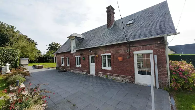 En Normandie, en Seine-Maritime (76), longère en briques idéale pour une résidence secondaire se situant tout proche des plages de Veulettes sur mer et des Petites Dalles. Elle comprend cuisine aménagée ouverte sur salle à manger, salon avec poêle à bois, salle d'eau avec WC. À l'étage trois chambres en enfilade. Le grand plus, une dépendance de 3 pièces comprenant garage 1vl, cave et atelier de jardin (cheminée présente) de plus de 25 m², grenier sur toute la surface de la dépendance. Honoraires de 10.000 euros à la charge de l'acquéreur et compris dans le prix soit 190.000 euros net vendeur.