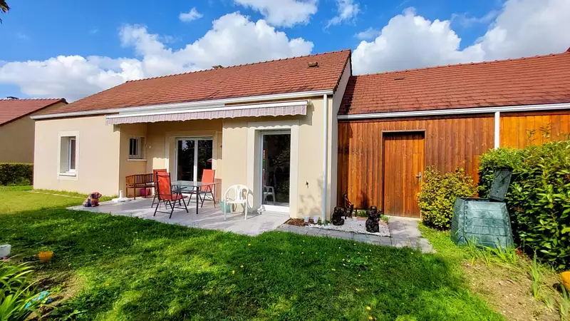 A Bracieux (10 mn de Chambord) , dans une résidence séniors sécurisée, maison de 78 m2 comprenant une entrée avec un placard, une pièce de vie de 28 m2, une cuisine aménagée et équipée, deux chambres de 13 m2 et 10 m2, une salle d'eau , WC indépendant, un cellier et un garage attenant, jardin d'environ 200 m2. Pompe à chaleur air/air. Exposition Nord/Sud.