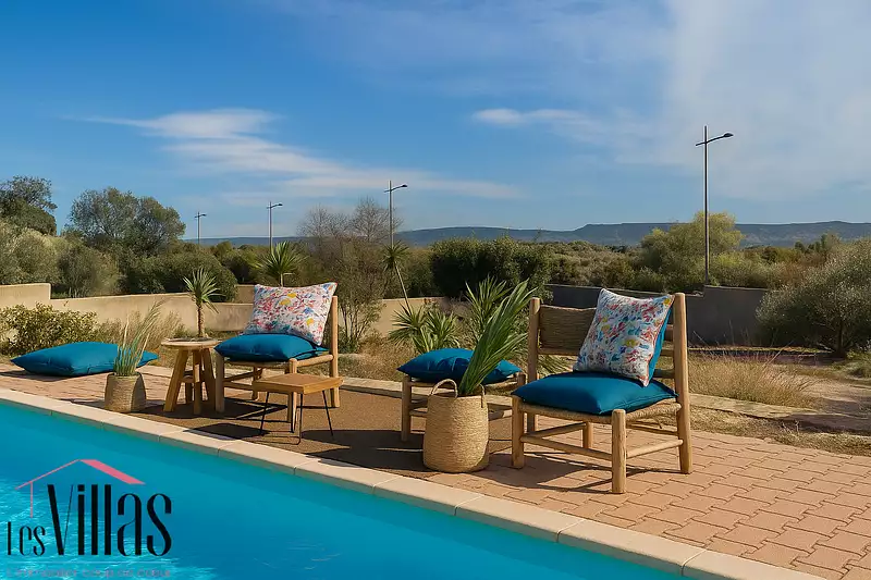 La maison est implantée sur un terrain de plus de 1000 m2, joliment arboré d’essences méditerranéennes, et propose plusieurs espaces extérieurs : une grande terrasse ensoleillée avec vue dégagée, un coin barbecue, un boulodrome et un agréable espace détente autour de la piscine 6 x 3m.