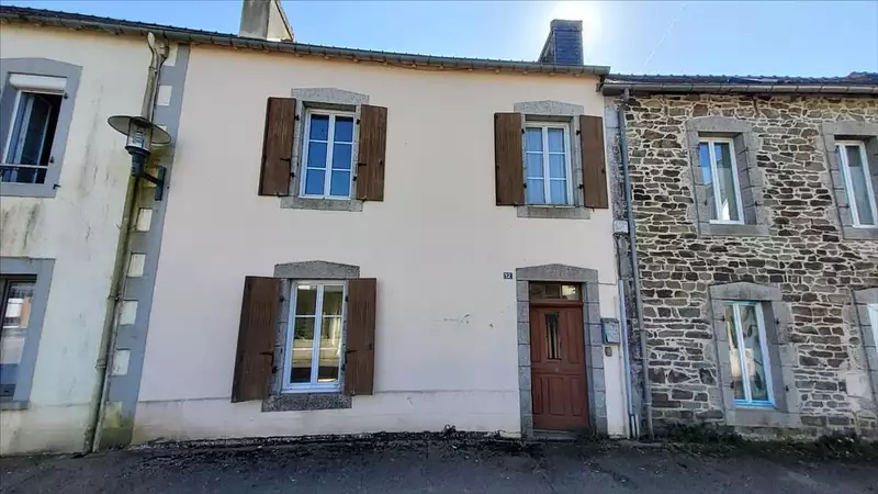 Au centre bourg, maison en pierres sous ardoises mitoyenne des deux côtés ayant:Entrée, salle à manger, cuisine, petite véranda avec wcA l'étage palier, bureau, salle d'eau, 2 chambres, WC, grenier au dessus.Cave et chaufferie.Jardin attenant, garage.