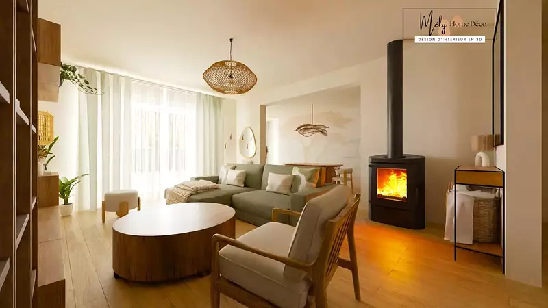 Maison de plain-pied entièrement rénovée en 2023, d’environ 80 m² habitables, avec garage isolé de 20 m² communiquant directement avec le salon.