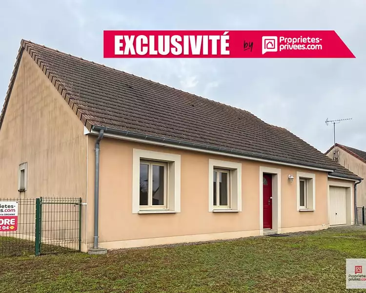 Maison de plain pied de 80m² comprenant : cuisine aménagée et équipée ouverte sur séjour - salon, 3 chambres, salle de bain (baignoire + douche), wc.
