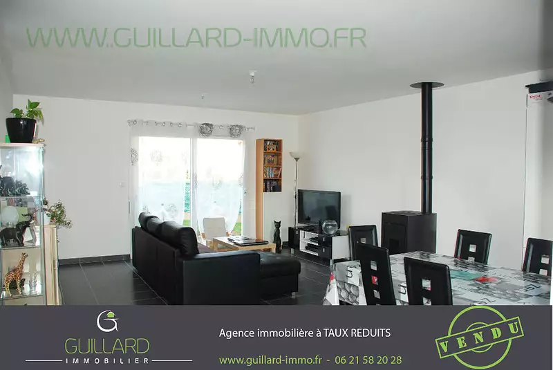 Maison vendue en deux visites par l'agence GUILLARD IMMOBILIER, Maison de plain-pied composée d'une cuisine aménagée-équipée ouverte sur le salon-séjour agrémenté d'un poêle à granulé vous offrant ainsi de beaux volumes de près de 40 m², trois chambres avec placards, une buanderie, une salle d'eau, wc séparé. Le tout sur un terrain clos et engazonné de 618m². GUILLARD Immobilier - Agent indépendant à taux réduits Le savoir-faire d'une professionnelle, la disponibilité d'une indépendante, à honoraire réduit ! Contactez-moi au 06 21 58 20 28