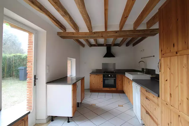 Pièce de vie avec cheminée insert, cuisine aménagée et équipée, wc, buanderie.