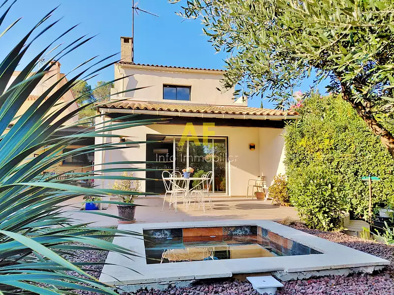BOULOURIS, proche des plages à pied, très agréable villa 4 pièces de style contemporain et en parfait état, dans quartier résidentiel entouré de verdure. La maison se compose au rez-de-chaussée d'un hall d'entrée avec un wc invités, une cuisine aménagée, un séjour salon ouvrant sur une terrasse couverte, le jardin avec jacuzzi, une cuisine d'été, une chambre de plain pied avec sa salle d'eau attenante. A l'étage : un palier desservant deux chambres dont une belle chambre parentale avec placard ouvrant sur terrasse avec aperçu mer, un wc avec fenêtre, une salle d'eau avec fenêtre. Le tout en parfait état et rénové avec goût. Carrelage grés céramique poli-brillant partout, ouvrants double vitrage avec volets roulants électriques, climatisation réversible dans le séjour et la chambre principale, jacuzzi, entrée pavée avec portail électrique et interphone, cellier / atelier attenant. Charges courantes annuelles 298 €. Honoraires charge vendeur